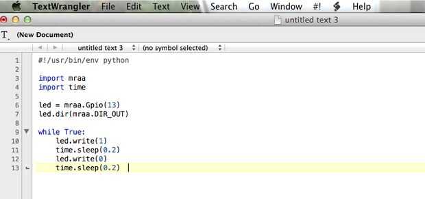 Ahora deja hacer algo un poco complejo, escribir un programa python que continuamente parpadea el LED conectado al pin #13, escriba el siguiente código python en tu editor de texto favorito, en mi caso estoy usando TextWrangler como se muestra en la pantalla por encima de.