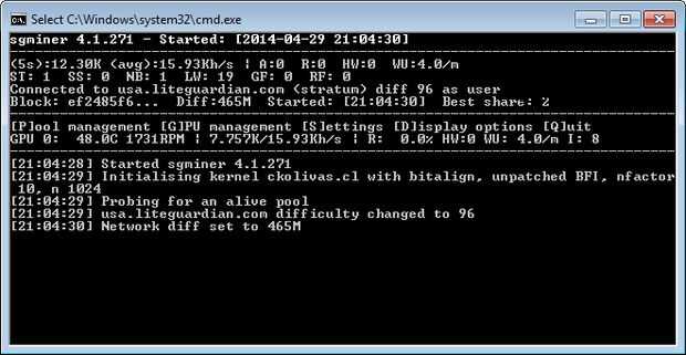 En este punto si fueras a guardar el archivo por lotes y haga doble clic en el directorio (debe guardarse en la misma carpeta que sgminer), sgminer debe iniciar y comenzar su proceso de explotación minera. Mientras que el programa ya sabe donde buscar trabajo, no está optimizado para su hardware y se ejecutará de manera ineficiente