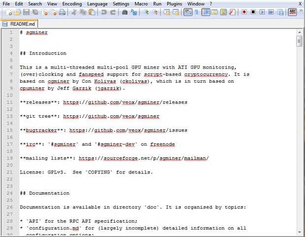 Un gran recurso para las diferentes opciones que están disponibles para sgminer se encuentran en la documentación del programa, que se encuentra en el directorio sgminer que hemos creado. El archivo 'README.md' se puede leer con un editor de texto como Notepad ++ o Wordpad. Vamos a usar Notepad ++ en el ejemplo.