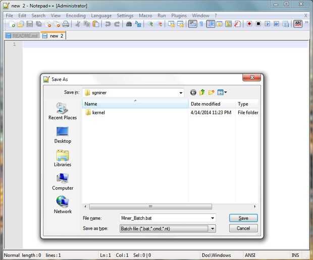 Crear un archivo nuevo en Notepad ++ y guardarlo en el directorio sgminer que hemos creado. Nombre del archivo lo que desee, sólo asegúrese de guardarlo como un "archivo por lotes". Ver imagen de arriba.