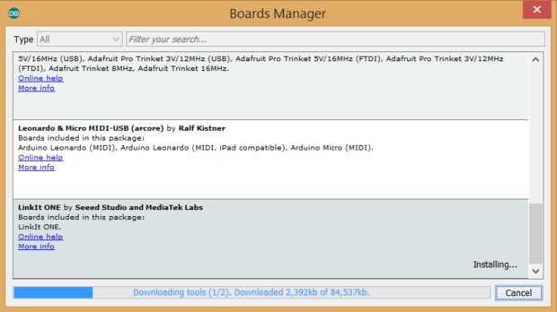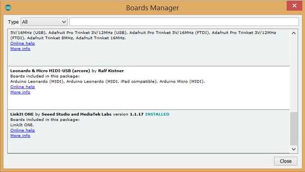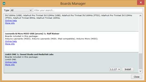 5. usted podrá seleccionar e instalar los tableros suministrados por las direcciones URL a las preferencias. LinkIt una semilla estudios y laboratorios de MediaTek se muestra ahora en el administrador de tablas. Seleccione la última versión de SDK un LinkIt y haga clic en instalar.