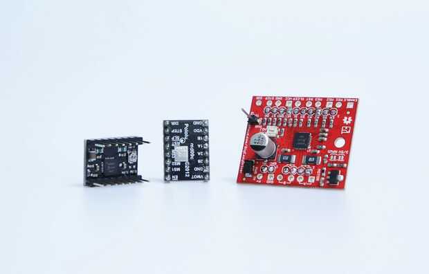 Si desea ponerse a controlar motores bipolares (o unipolar en una configuración bipolar), querrá volver a agarrar una tabla de breakout controlador dedicado. Foto de arriba son el Gran conductor fácil y la Junta A4988 paso a paso de conductor de autotransporte . Estas placas están breakout PCB para el Allegro A4988 microstepping paso a paso bipolar conductor del motor, que es una de las fichas más comunes para manejar motores paso a paso más pequeño. Aparte de tener los necesarios doble h-puentes para la conducción de un motor bipolar, estos tableros paquete de un montón de golpe por un pequeño paquete de bajo costo. Puedes leer un desglose sólido de características en la Página Web del chip, pero vamos a hablar de las características más importantes aquí.