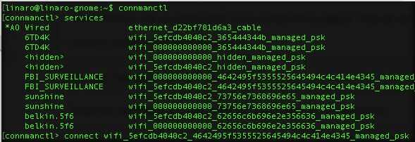 $ connmanctl$ enable wifi$ scan wifi$ services