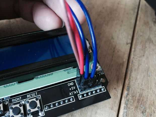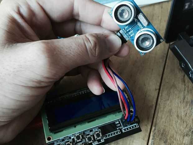 Para conectarlo simplemente entre "vcc" una + escudo de 5V en el, con toma de tierra del protector del "Gnd" del sensor, "Trig" y la entrada A1, y "Eco" en el A2, así como se ve en la foto.