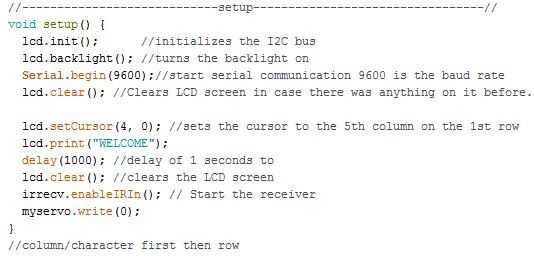 Pasar a la configuración, se inicializó el i2C bus en la pantalla de LCD que estoy usando. I2C esencialmente reduce el número de pines que tengo que usar en mi Arduino. Inicialice la retroiluminación de la pantalla. Si desea ver los resultados en un monitor serial debe utilizar un comando de Serial.begin(baudrate) para establecer cuántos símbolos para leer. Esto inicia la comunicación entre el Arduino y el monitor serie. Limpiar la pantalla LCD en el caso hay símbolos erróneos o letras en la pantalla. I ajustar el cursor en el centro de la primera fila y el usuario para el módulo. Espera un segundo y la pantalla se borra otra vez. El receptor IR está listo para tomar en los valores de lo IR remoto. Del mismo modo, el motor servo se mueve a la posición 0.