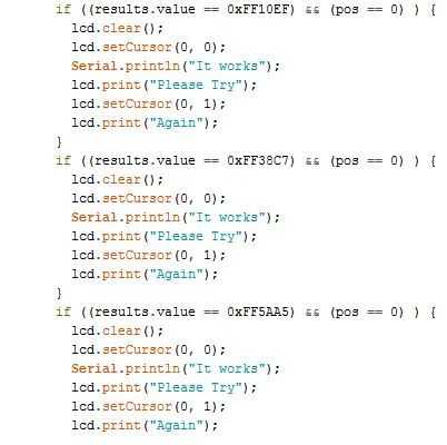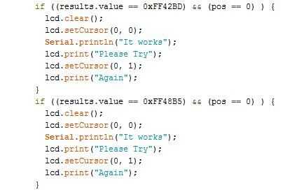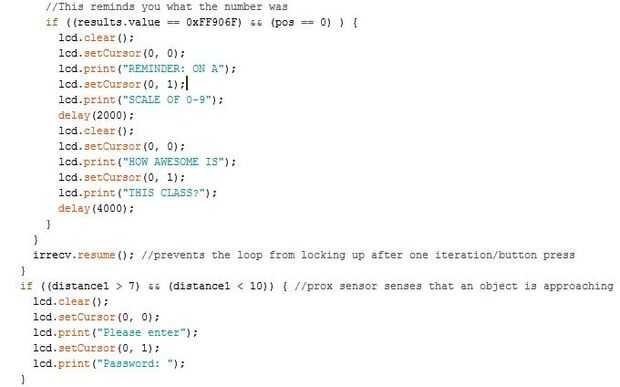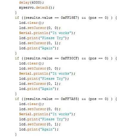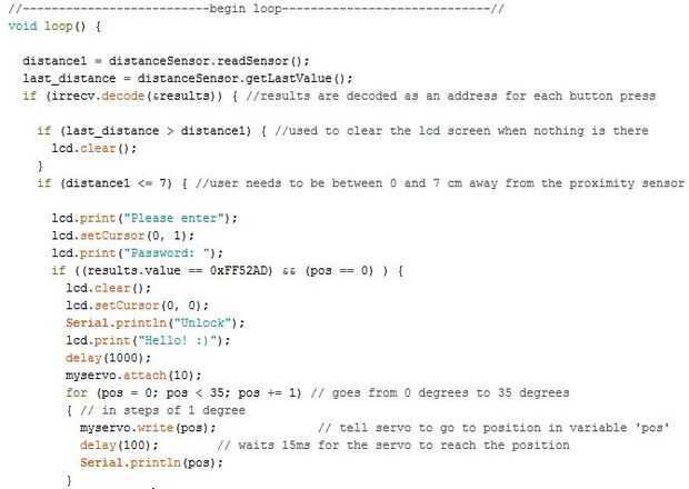 Finalmente, nos movemos en el bucle principal. Distance1 se declara como el disparador que es enviado y recibido. Este valor se lee desde el sensor de proximidad para el Arduino en centímetros. last_distance hace como su nombre lo indica. Almacena la última distancia que se lee. Se proporcionarán más detalles en cuanto a la función de estos comandos después. El si (irrecv.decode (y resultados)) comando se utiliza para asignar la dirección de cada pulsación de botón. Cada botón tiene su propio flujo de bits asociado a ella. Porque este proyecto es abrir una cerradura con un valor especificado, este comando debe ser el primer lazo en el bucle principal. last_distance > distance1 compara los valores que se almacenaron. Si la distancia anterior fue mayor que la distancia actual y luego la pantalla se borra ya que no hay nadie en la puerta. Del mismo modo, si distance1 < = 7 (cm) entonces se solicitará al usuario que ingrese la contraseña. Un solo valor trabajo (9). Todos los demás valores (0-8) serán instruir al usuario a intentarlo de nuevo. Sin embargo, para el valor de = 9, la puerta se abre y saluda al usuario. También, hay un anidados para el lazo en este si declaración. El anidado para lazo permite el motor del retroceso en y simular el desbloqueo de la puerta. La distancia < = 7 está aquí para comprobar si el usuario está en la puerta o si él o ella ha ido dentro o a la izquierda. Si el usuario está en la puerta, la puerta permanecerá abierta. La puerta permanecerá abierta durante unos 4 segundos permitir al usuario a pasar por la puerta y luego se procederá a cerrar. Retardo de los 4 segundos, se desconecta el motor servo. Hago esto para evitar que el exceso de potencia siendo entregado al motor cuando no está en uso. Además, tengo serial.println() comandos para mostrar los resultados en el monitor serie.