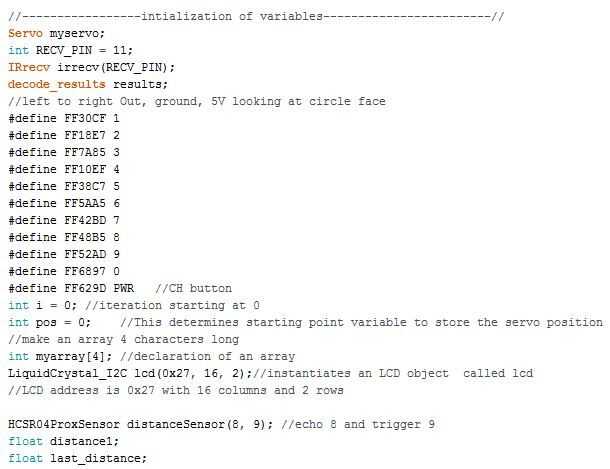 A continuación que pasemos a la inicialización de las variables. Tenemos varias clases de las bibliotecas de Servo, IRremote, LiquidCrystal y HCSR04 y las variables que se declaran. También he definido varios de los botones del control remoto que utiliza. La clase LiquidCrystal crea una instancia de un objeto de LCD llamado "lcd". La dirección de la LCD es 0x27 con 16 columnas y 2 filas. El Sensor de proximidad de HCSR04 tiene dos disparadores. El pin de "gatillo" es responsable de enviar un pulso. Este pulso rebota (ecos) o es disipado en el espacio. El pin de "Eco" recibe un valor flotante asignado al pin 8. Este disparador se lleva en el pulso de disparo y convierte el valor en centímetros (por mi propia biblioteca diseñada). Las distancias que recibe el sensor de proximidad se definen como valores de flotación. Podría se han definido como valores enteros pero quería que las mediciones sean exactas y esto significa que los valores que se leen valores decimales (un ejemplo sería cm 6,52).