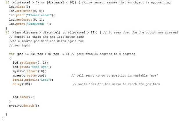 Cerrando el bucle, tengo un if final declaración. Si la última distancia es mayor que la distancia actual, significa que el usuario no está en ninguna parte ser encontrado. Además, lo tengo comprobación para asegurarse de que el usuario no es cualquier lugar para ser visto por incluyendo & & distance1 > 12 (cm). Esto significa que alguien estuvo allí y salió. Otra vez se borra la pantalla. Hay un anidados para el lazo que dice: bueno vi que la puerta se abrió, el bloqueo fue movido a la posición de desbloqueo y ahora se moverá hacia atrás a la posición de bloqueo. El servomotor está conectado y la pantalla LCD indica la persona bueno bye. El motor retrocede 35 grados a la posición de bloqueo. Después el motor servo con su tarea, otra vez se desconecta para evitar forzar el motor y reducir al mínimo la energía utilizada para alimentar el motor servo. Esto es el fin del bucle y funcionará continuamente.