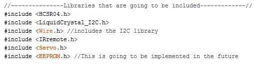 Voy a ir sección por sección discutiendo las características principales del código. Bibliotecas de terceros pueden ser importadas desde GitHub. Las bibliotecas LiquidCrystal y IRremote pueden encontrarse en GitHub. Tuve que crear la biblioteca desde cero para el Sensor de proximidad HCSR04 (ojalá lo encontrarás adjunta arriba). En estas bibliotecas, puede encontrar las variables necesarias para enviar un comando o llamar a una función. Cada biblioteca tiene un C++ (software para la codificación) y .h (archivos de encabezado de extensión). Si a crear sus propias bibliotecas, necesita crear ambos.