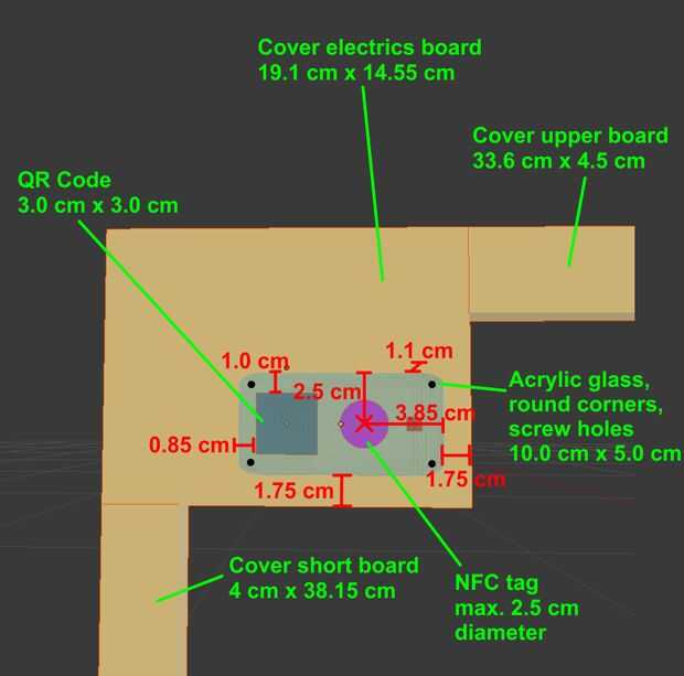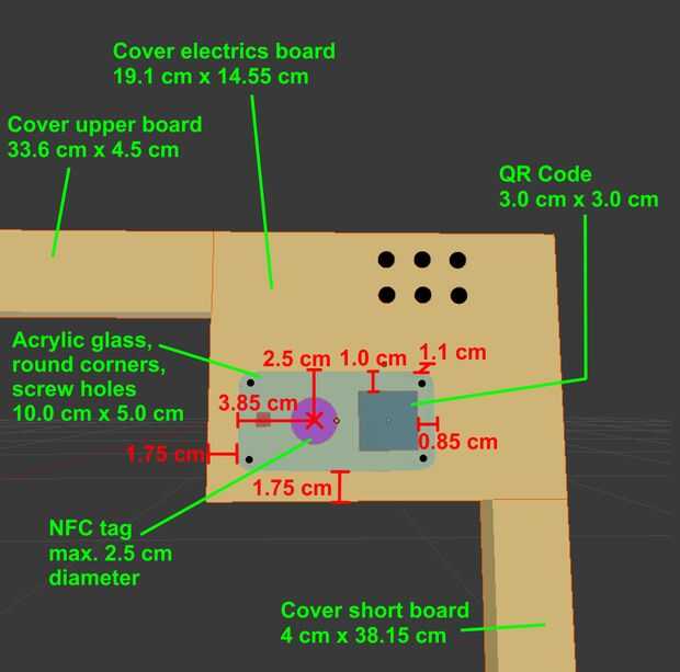 Ahora debe saber cómo conectar con el Pi de frambuesa usando un web browser. En la mayoría de los casos usted tendrá una dirección IP, para que pueda acceder la frambuesa Pi directamente en tu red. Por ejemplo, podría tener una URL como http://192.168.178.5/ a su frambuesa Pi. En internet encontrará múltiples generadores de código QR. Utilice uno de ellos para crear un código QR que contiene esa URL para su frambuesa Pi. Asegurarse que usted puede imprimir el archivo resultante como un 3,0 x 3,0 cm código QR más adelante. Esto permitirá que un smartphone leer el código QR en una distancia de unos 30 cm. impresión dos QR-codes de ese tamaño. Si el teléfono inteligente compatible con la tecnología NFC, puede obtener una aplicación de NFC, que permite escribir la URL en la etiqueta NFC. También debe preparar dos etiquetas NFC de esta manera. Pegar con ambas piezas de 10,0 x 5,0 cm de vidrio acrílico como se muestra en las fotos. Atornillar las piezas de vidrio acrílico junto con las superficies de aglomerado y utilice a los espaciadores de plástico para obtener algo de espacio entre las piezas de vidrio acrílico y el conglomerado y para ocultar los tornillos.