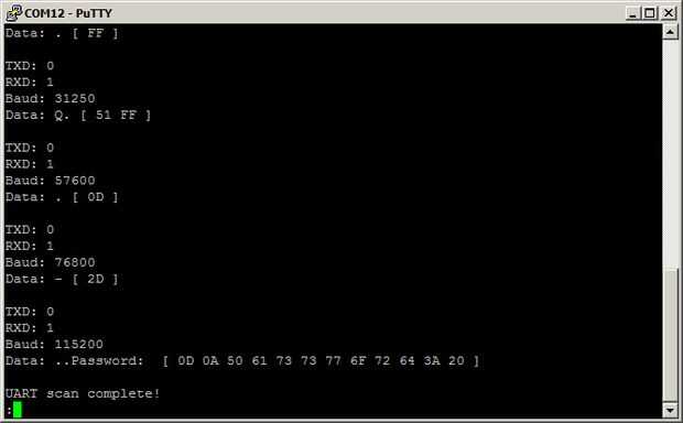 Aquí está la última parte de todo el texto de que la Jtagulator nos ha enviado durante el escaneo de una UART. Medida que se desplaza a través de todos ellos, echa un vistazo a los ' datos:' en mi ejemplo, el único que escupa cualquier cosa que parece humano legible es la última.