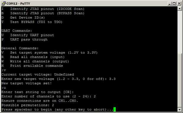 ¿Recuerdas cuando dije que no importaba el orden de los dos cables de tierra no? Una de las características de la Jtagulator es que puede tratar todo el cableado posible uart y permutaciones de velocidad para descubrir un puerto serie por fuerza bruta.