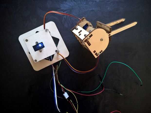 El servo de la base debe conectarse al pin 6 y el uno para el brazo al pin 5. Los otros cables de los servos también van a la placa. Finalmente el motor paso a paso está conectado al chip controlador. Este chip está conectado con un 5v y un cable de tierra a la placa. In1 a IN4 está conectado a los pines 8 y 11. Que tendrás que cambiar el orden en que los pernos se colocan si el motor no se mueve.