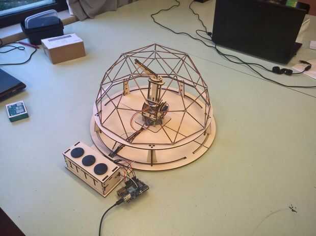 Colocar el robot en la parte superior la base servo y deja que ir a todos los cables a través del orificio en la parte inferior. Que el lugar del robot en el centro de la placa de masa.