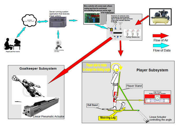 En detalles, que quería construir para un amigo mío (Kim), un sistema con un jugador robótico que los usuarios deben ser capaces de control sobre la internet, a través de una aplicación de Facebook con un portero automático. Los usuarios serán capaces de controlar el ángulo y la potencia de la patada, pero no tienen control sobre el portero, que se mueve al azar de izquierda a derecha, después de que el jugador ejecuta el comando para patear la pelota. Programé un retraso de 4-5 segundos después de que el jugador hace la selección de ángulo y potencia y el portero se pone en movimiento.