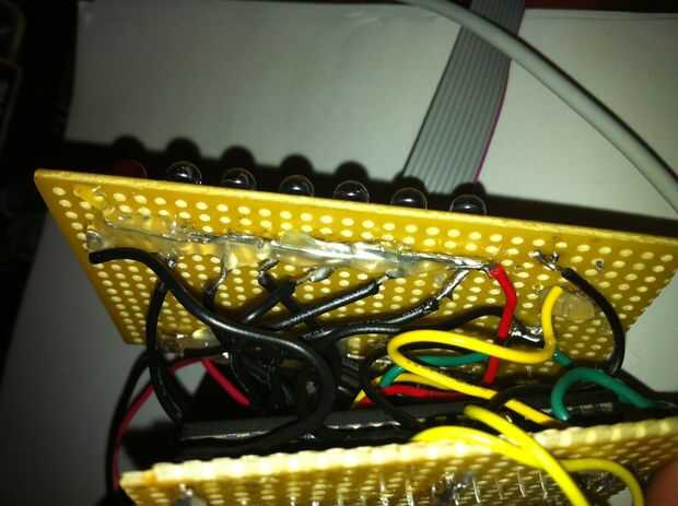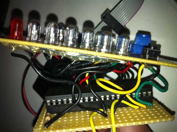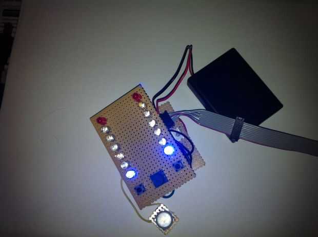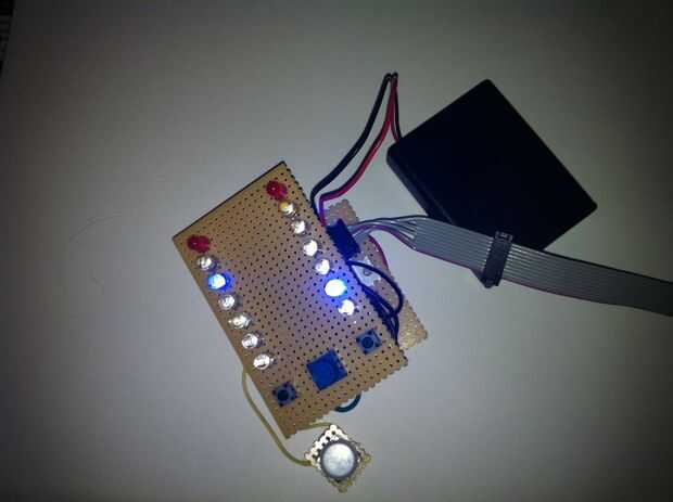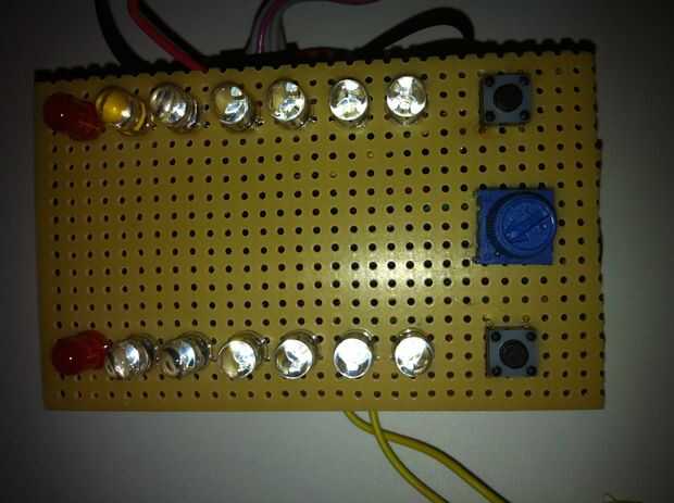 Tengo dos filas de 7 LEDs, dos botones al final de cada fila y un potenciómetro entre los dos botones. Los botones de uso, a partir de ahora, únicamente con el propósito de tocar el botón de juego de carreras. El potenciómetro sólo se utiliza en el control de la velocidad que el LED persiguen uno al otro. Entonces tengo un botón más grande que no está conectado a los dos tableros principales perf. Sirve como el botón para cambiar entre programas. Realmente no es complicado si usted tiene una comprensión justa de programación AVR micorcontrollers. Para el contador de LED y la carrera de botón me dio la idea y algo del código, los tutoriales en NewbieHack.com. Me ha tomado mucho tiempo hacerlo porque he hecho muchos errores por descuido de soldadura y entonces decidir caliente pegar todos juntos antes de revisar mis conexiones. Así que tuve que arreglarlo todo, varias veces y de eso han tenido cargas de tareas que hacer durante las últimas semanas. Pero finalmente conseguí hacerlo! Espero que todo el mundo que ve el instructable tiene gusto de él. Si alguien necesita mi ayuda en los lados de hardware o software, de lo que estaría encantado de ayudar a tan solo comentario y haré mi mejor esfuerzo.