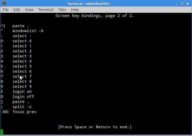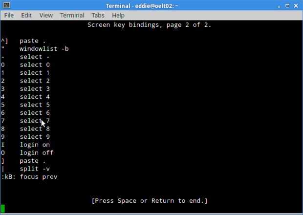 Pantalla le permite moverse hacia adelante y hacia atrás. En el ejemplo anterior, usted podría utilizar "Ctrl-a" n"para regresar al principio. Este comando le cambia a la siguiente ventana.