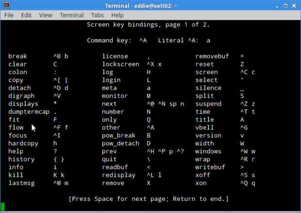 Atajos de teclado son los comandos de que la pantalla acepta después pulsas "Ctrl-a". Puede volver a configurar estas teclas a tu gusto usando un archivo .screenrc, pero yo sólo uso los valores por defecto.