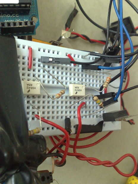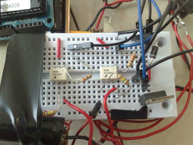 Estoy usando el protoboard porque no quiero perder tiempo de soldadura (y desoldering cuando quería mi optoacopladores hacia atrás). Se nota que no soy un profesional en esto, por favor disculpa mis dibujos. Ver diagrama no. 2 para ver las conexiones y las fotos para ver en la vida real.