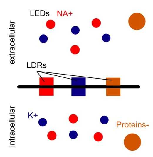 El objetivo es diseñar un entorno de hardware que permite simular el movimiento de iones en neuronas con luz. Nota aquí que la simulación debe realmente llevará a cabo en el nivel de luz, cualquier luz, generado por el hardware sí mismo pero también la luz externa, debe tenerse en cuenta. La respuesta es la resistencia dependiente de luz (LDR). Echar un vistazo a la figura 7 para el programa de instalación. Los iones están modelados por la luz (es decir, fotones) que se generan por LEDs. Concentración de ionesy así la concentración de carga, es simulado por la cantidad de fotones en un lugar determinado. Si uno implementa diferentes colores (es decir fotones de diferentes longitudes de onda), tipos de iones diferentes también puede ser codificado. Así, diferentes LEDs y LDRs correspondiente a colores particulares (es decir, por un filtro de color) son necesarios para la realización técnica. En la actual configuración del hardware que hice no aplicar diverso color sensibles LDRs blindados pero los LDRs del uno al otro, pero la idea son color sensibles LDRs. Por blindar el hardware simula dos tipos de iones.