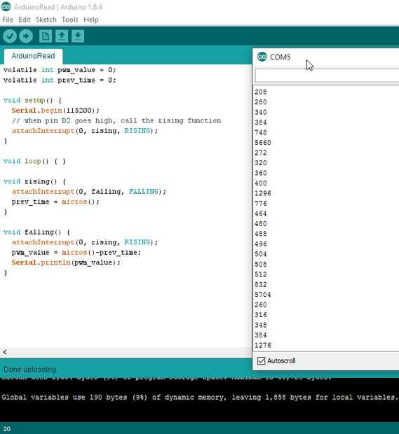volatile int pwm_value = 0;volatile int prev_time = 0; void setup() { Serial.begin(115200); // when pin D2 goes high, call the rising function attachInterrupt(0, rising, RISING); } void loop() { } void rising() { attachInterrupt(0, falling, FALLING); prev_time = micros(); } void falling() { attachInterrupt(0, rising, RISING); pwm_value = micros()-prev_time; Serial.println(pwm_value); } Presionando cada botón y empujar palos arriba y abajo, verá una secuencia de números que representan la longitud de los pulsos de microsegundos (tiempo que la señal de alto).
