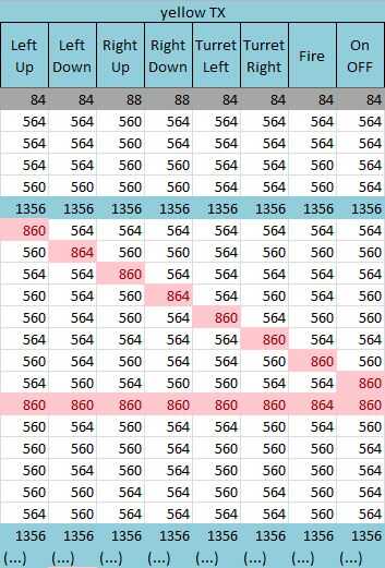Así, podemos ver: un largo pulso de 1356 micros (es "sincronizar" un buen nombre?) dos pulsos de 860 micros (comando) y 12 pulsos de 564 micros
