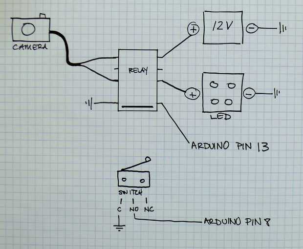 Se activa el interruptor de rodillos por las rampas construidas en el rodillo del piñón. El Arduino se utiliza para activar el relé. El relé activa el cable de obturador de la cámara cuando el interruptor del rodillo cambia Estados. Ver la última foto en este paso de un diagrama de todas las conexiones de cable.