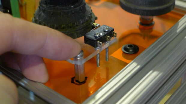 - Monte el interruptor de rodillo a una pieza de acrílico o madera y con un enfrentamiento de 1.25" para montar el brazo del interruptor a la plataforma de la puerta. Nota: la altura del separador cambia según el calibre de la película su exploración. Un enfrentamiento mayor se utiliza para 16mm a 35mm - dependiendo de las piernas Qué precisión tienen en la plataforma de la puerta que tendrá que cortar o extender tuyo.