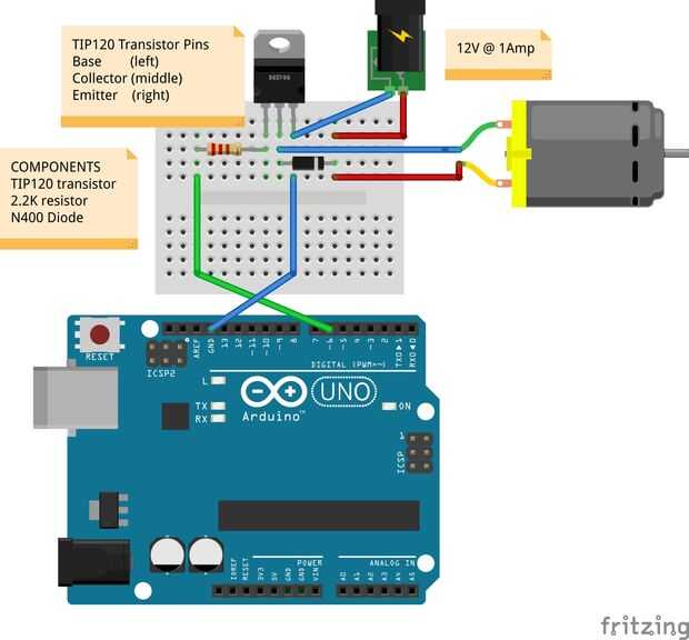 - Utilizando el esquema proporcionado, hacer el circuito del motor y conectarlo a la corriente y Arduino. Puede incorporar este circuito en el circuito de relé o mantenerlo separado. De cualquier manera funciona. Este circuito controla el motor con PWM (pulse-width-modulation). Cambia la velocidad del motor para cumplir con la variable de cuadros por segundo en el software. En algunos casos, puede que desee controlar el motor manualmente. Mientras que esta es una característica que planea integrar, no está disponible actualmente. Tiene control manual completo, conectar el motor a una fuente de alimentación ajustable según sus requisitos de energía y ajustar la tensión para cambiar la velocidad.