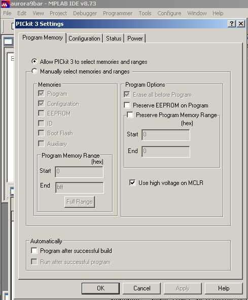 - Usted necesita utilizar el modo de "programación alta tensión", para escribir todos los bits de configuración necesarios para Aurora 9 x 18. Encontrará esta opción en IDE, en el menú "Programador" -> "Configuración". En la pestaña de "Memoria de programa", ver "Tensión alta uso en MCLR".