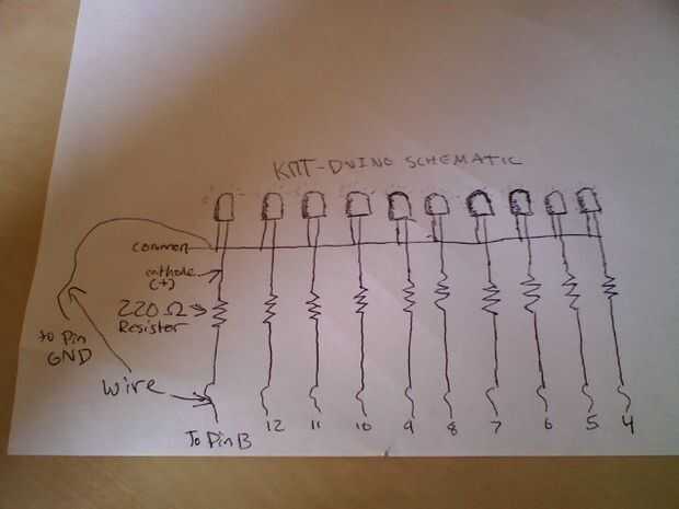 5-introducir un lado de la resistencia en un agujero que es vertical en línea con el cátodo de cada LED. Inserte el otro extremo en un agujero en el hueco sin los agujeros. Asegúrese de que no es el inferior. Doblar las puntas para lograr que permanezca.