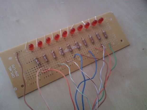 4 - Insertar los LEDs en el tablero como se muestra. Usted es la diferencia real entre ellos. A mi me funciono cada 3 agujeros. Doble las puntas hacia abajo para mantenerla en su lugar. Asegúrese de que el lado negativo está pasando por un agujero que se platea en una tira larga para conectar con todos los otros ánodos de los LED.