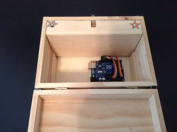 Internamente, un Arduino Uno en la parte inferior de la caja y una placa de circuito en la parte delantera de la caja ocultados y protegidas por dos cubiertas: un falso fondo y una tapa frontal (placa de circuito).