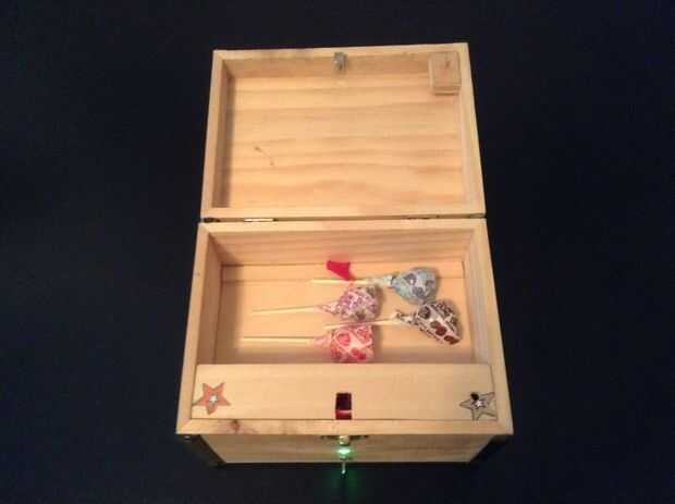 Si coincide con el golpe, el LED va verde, desbloquea el servo, resortes de la tapa abierta y los niños recuperar su tratamiento.