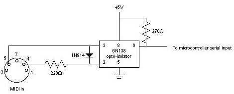 El MIDI en es serie a 32150 baudios. El sistema es de 3 bytes. El primer byte es si es o no la nota encendido o apagado. El segundo es el valor de la nota y el tercero es la velocidad, pero desconozco.