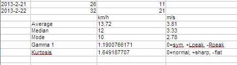 Media es una herramienta conocida, median poco menos es conocido (como muchos días arriba como por debajo de esta cifra) y modo demuestra lo más a menudo de velocidad (pero no divide los datos en clases todavía). La asimetría (gamma 1) y la curtosis dan una idea del tipo de curva de la muestra sin dibujándola.