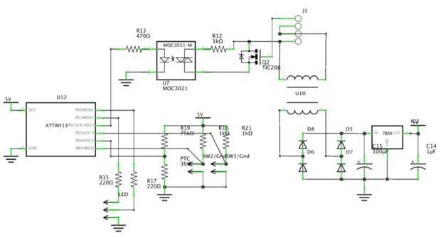 El circuito final consiste de una fuente de alimentación simple, el Attiny (yo usé un 85 ya que tuve una vez ahí, pero a 13 bastaría también) y el interruptor triac para la calefacción.
