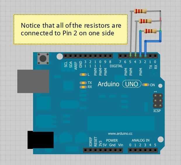 Una vez que sus resistencias a su seleccionado pernos y pasador común de entrada, asegúrese de que funcionen correctamente al ejecutar el código de ejemplo básico de esta biblioteca, abrir el serial monitor y asegúrese de que está obteniendo una lectura al tocar el lado de la entrada, tome nota de los valores generados al inicio del estudio y mientras se toca el cable de entrada. Una vez que tengas el lado arduino de cosas funciona correctamente, conecte sus sensores de circuito a cada lado de la entrada de resistencias individuales. Comprobar que los sensores están recibiendo buenas lecturas después de colocar las placas de circuitos y tenga en cuenta los cambios probables para los valores de la serie monitor para que pueda utilizar estos valores en el código más tarde.