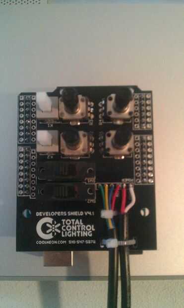 Fresco neón ahora también lleva un escudo maravilloso desarrolladores para conectar fácilmente su filamento TCL a un arduino o seeeduino, cuantos dólares son bien gastados si quiere salvar algunos problemas de soldadura y ser capaces de desmontar su hardware con facilidad cuando quieras. Con el LED ahora conectado, instalar la biblioteca y ejecutar algunos del código de ejemplo para asegurarse de que las luces funcionan correctamente.