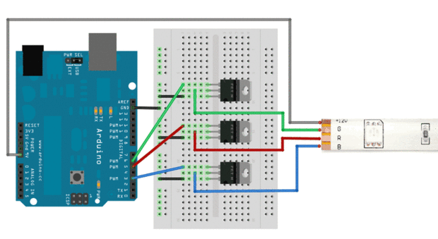 Siguiendo el esquema anterior, conectar 3, MOSFET de canal N a tu Arduino para controlar la corriente a los canales rojo, verde y azul de la tira LED. Conectar el + 12V de la tira del LED a su fuente de alimentación de 12V DC. Al comprar una fuente de alimentación, asegúrese de que proporciona suficiente corriente para su entera tira de LED. 1 metro de la tira de 60 LED de Adafruit dibujar aproximadamente 1 amperio de corriente, por lo tanto un plan como corresponde.