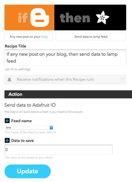3. configuración de IFTTT para conectarse a Adafruit.io (ver imagen)