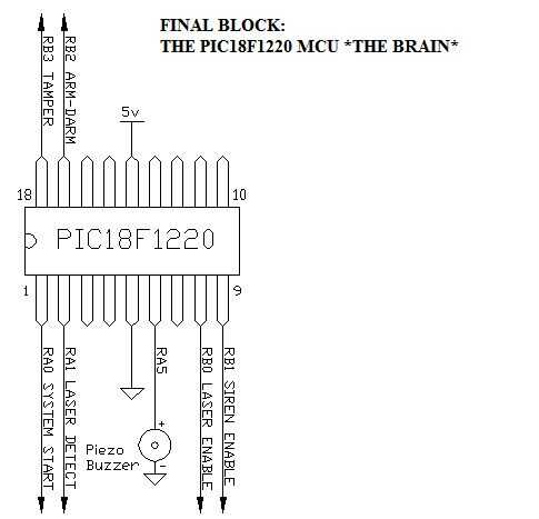 De todos modos, este chip actúa para interpretar las condiciones de entrada, procesarlos y señales bajo control del software. Si vas a la página de algoritmo, usted tendrá una mejor idea de lo que estoy hablando sobre. Tenemos un zumbador piezoeléctrico DC 5v en el pin RA5, que se ha configurado como una salida. Este piezo nos dicen cuando se ha ingresado el código de brazo, cuando las luces se han ido (cuando se inicia el programa de láser), y cuando el sistema ha sido desactivado.