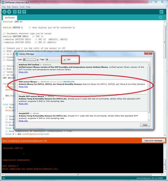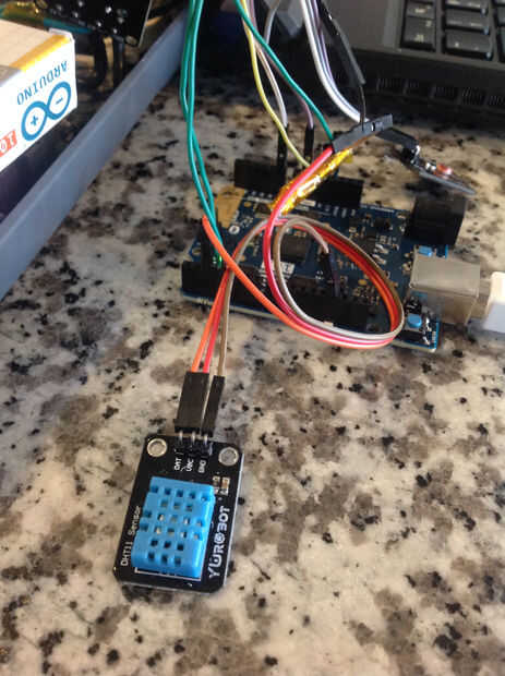 #include DHT.h> //Due to web tags, I can't include symbol < on this line#define DHTPIN 2 //What digital pin we're connected to #define DHTTYPE DHT11 //Sensor model DHT dht(DHTPIN, DHTTYPE);void setup() { Serial.begin(9600); Serial.println("DHTxx test!"); dht.begin(); }void loop() { // Wait a few seconds between measurements. delay(2000); // Reading temperature or humidity takes about 250 milliseconds! // Sensor readings may also be up to 2 seconds 'old'(very slow sensor) float h = dht.readHumidity(); // Read temperature as Celsius (the default) float t = dht.readTemperature(); // Read temperature as Fahrenheit (isFahrenheit = true) float f = dht.readTemperature(true); // Check if any reads failed and exit early (to try again). if (isnan(h) || isnan(t) || isnan(f)) { Serial.println("Failed to read from DHT sensor!"); return; } // Compute heat index in Fahrenheit (the default) float hif = dht.computeHeatIndex(f, h); // Compute heat index in Celsius (isFahreheit = false) float hic = dht.computeHeatIndex(t, h, false); Serial.print("Humidity: "); Serial.print(h); Serial.print(" %\t"); Serial.print("Temperature: "); Serial.print(t); Serial.print(" *C "); Serial.print(f); Serial.print(" *F\t"); Serial.print("Heat index: "); Serial.print(hic); Serial.print(" *C "); Serial.print(hif); Serial.println(" *F"); }