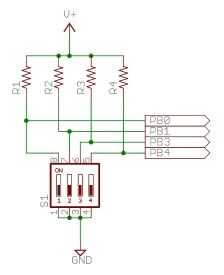 La figura muestra un simple juego de interruptores de entrada. Esto es simplemente un paquete de cuatro interruptores encendido/apagado; también conocido como unipolar, solo tiro (SPST) los interruptores. Normalmente, una conexión, o polo, de cada interruptor está ligada a la tierra mientras que la otra conexión se tiró alta a través de un resistor limitador actual (10K o menos). Una entrada del microcontrolador está conectada al polo con la resistencia. Si el interruptor está abierto, el microcontrolador leerá la entrada como HI. Si el interruptor está cerrado, el microcontrolador leerá la entrada LO. Consulte el esquema para los detalles.