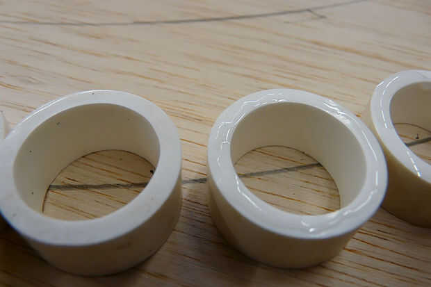 Una vez que las piezas secas son acusadas, es hora de utilizar el pegamento y pegar los anillos hacia abajo en su lugar. El pegamento se seca muy rápido y hace más fácil seguir trabajando en los anillos próximos sin preocuparse de ellos moverse mientras están secando.
