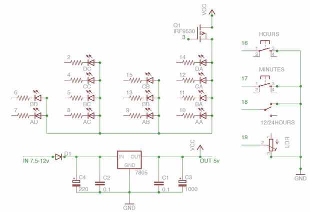Los LEDs en la demostración esquemática que del real los lugares para los LEDs, la columna de la derecha tiene 4 LEDs, el siguiente 3, el una 4 red, el siguiente 2. (Vista frontal)