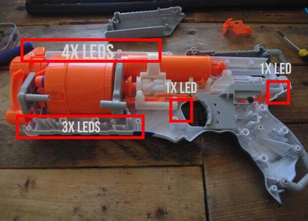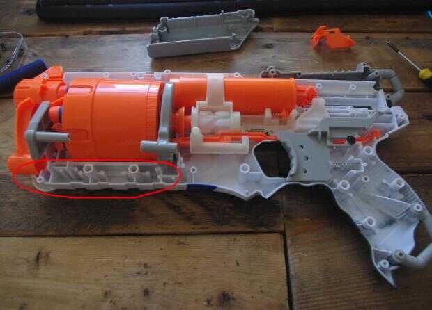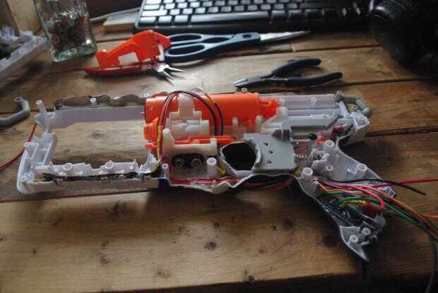 Esta foto fue de la revisión 1 del mod, más tarde que descubrí que los cables pasando por el naranja cañón causaban que disparar muy incoherente y fueron reencaminados debajo de él, que fuera el caso. Recuerde: Si usted piensa que lo que hice fue una locura entonces no dude en hacerlo otra forma.