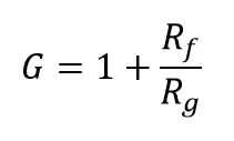 La ganancia se obtiene con un simple amplificador de voltaje no inversor (imagen 3), y se calcula por "G" (ecuación de imagen 4).