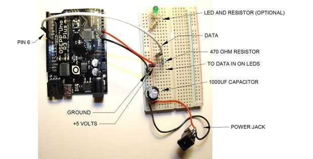 Refiriéndose a la imagen, coloque el condensador a través de las líneas de buss de alimentación asegurándose de que el + lado del condensador va al + de la buss y negativo a negativo. Coloque la resistencia en 2 de las filas del área de componente. La potencia led y su resistencia puede también ser conectado si decide utilizarlos. Ejecutar 2 cables de puente de la potencia de buss a Arduino, + a Vin y - a tierra. , otro puente del perno 6 a un extremo de la resistencia. Las conexiones de cadena led son: DI (datos) al otro extremo del resistor, 5V + y tierra -.