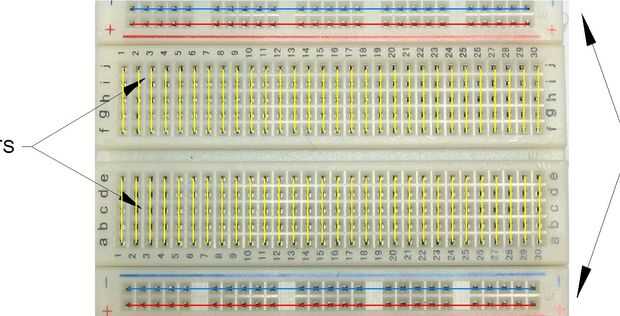 Si no está familiarizado con breadboards, ver la foto. Muestra cómo los terminales están conectados por debajo. Los buses de energía están conectados horizontalmente a lo largo de cada fila y los conectores de mediados se unen en filas de 5.